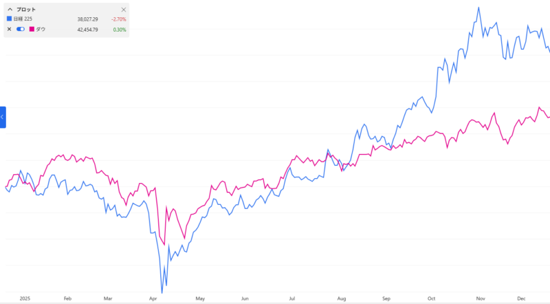 8月、日経平均がダウを上回る伸びがありました。その後、10月に高市総理が誕生したところで大きく伸ばし、5万円を軽々超えました。